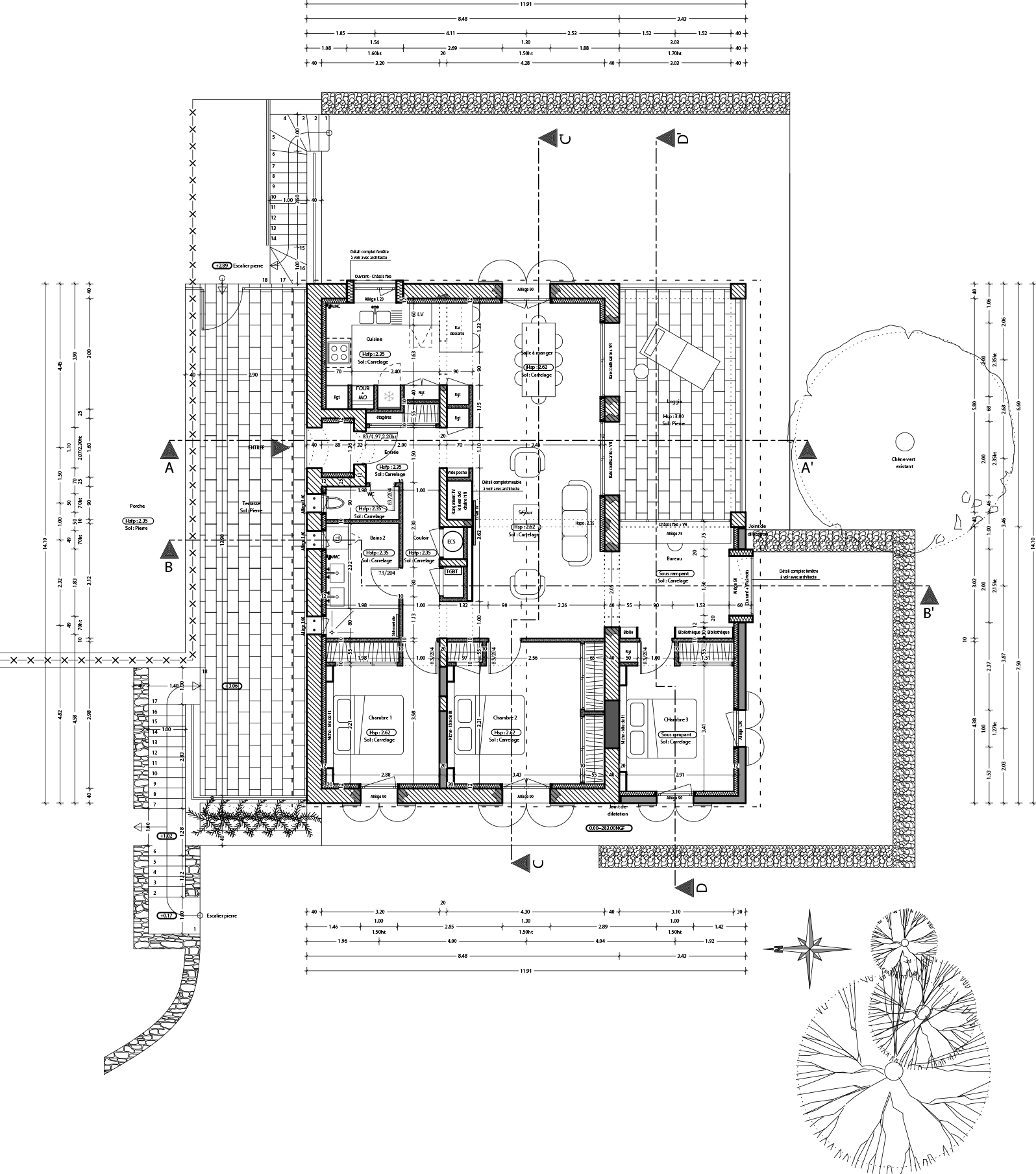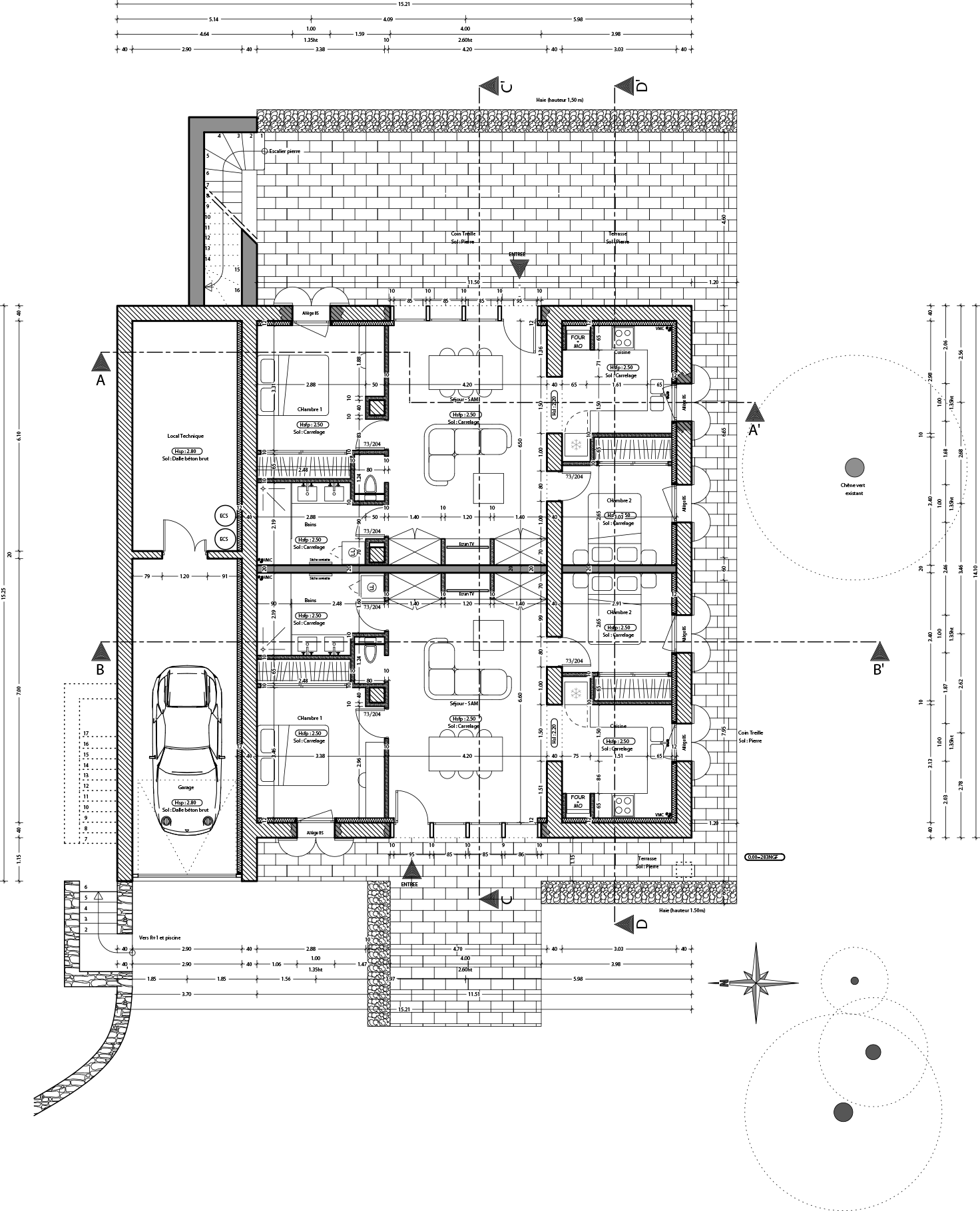Les deux appartements en rez-de-jardin d’une surface de 62 m2 s’ouvrent sur une terrasse privative et un jardin d’agrément (un à l’est, l’autre à l’ouest).